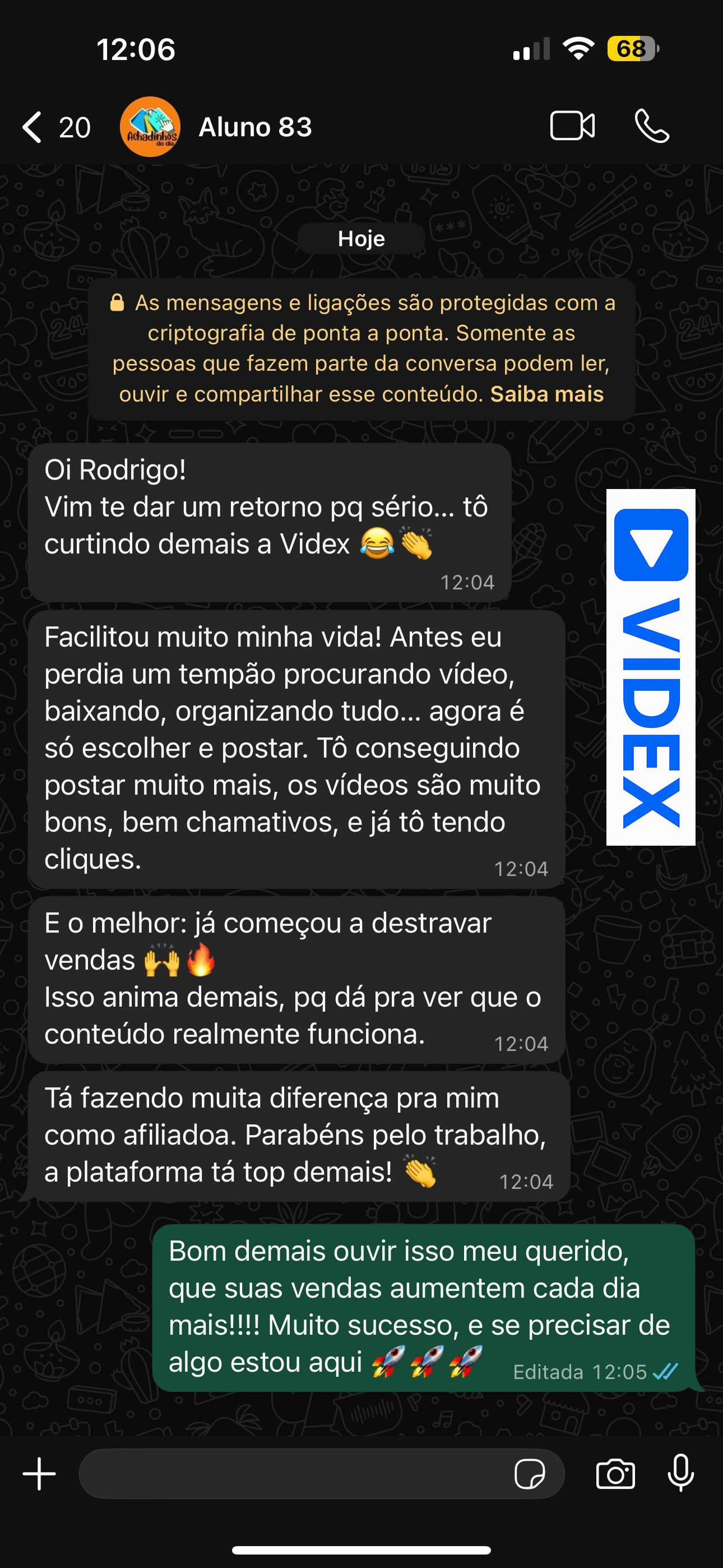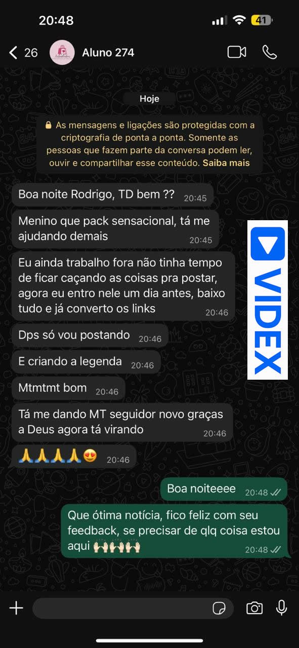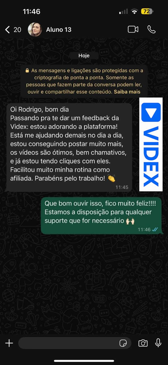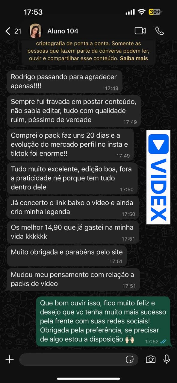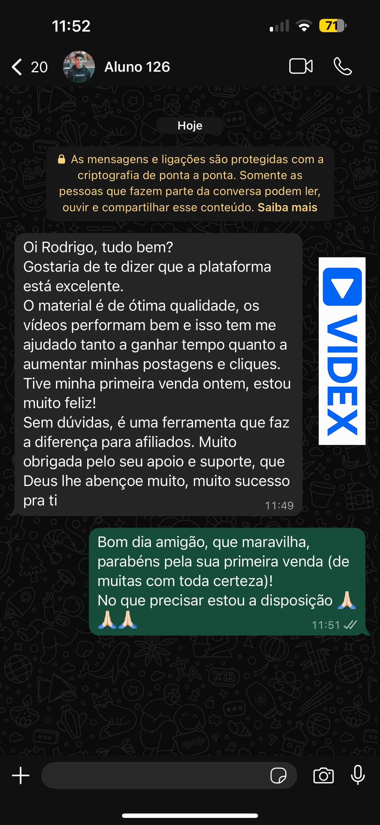 "Em 2 dias já fiz 14 vendas usando só vídeos do Videx!" — Mariana S.
